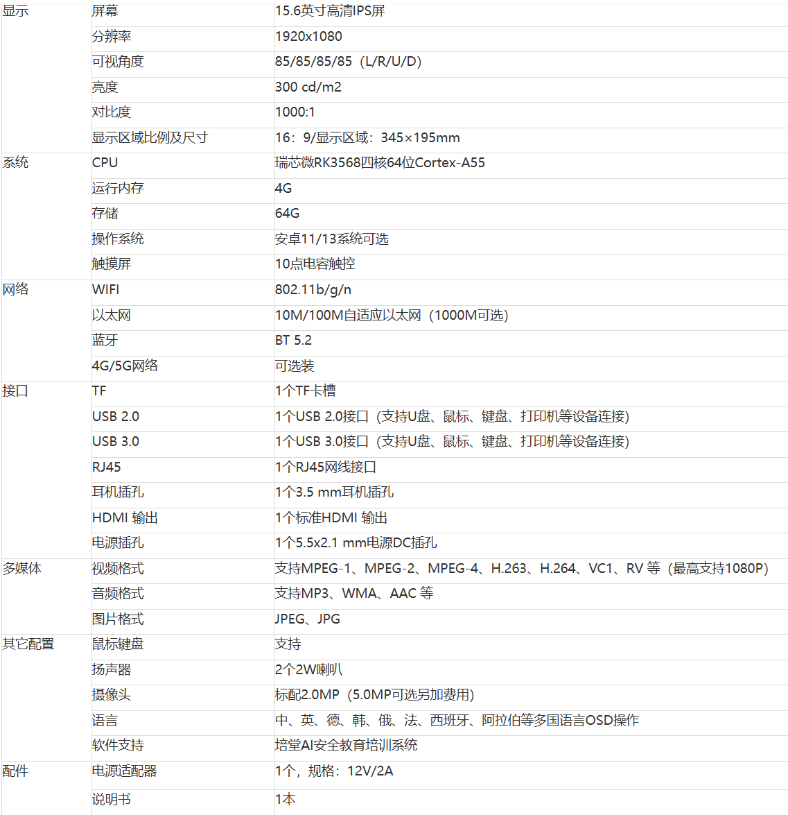 硬件与技术支撑:采用15.6英寸高清IPS屏,搭配瑞芯微RK3568四核处理器,支持刷脸登录、扫码签到等功能,确保培训参与真实性。同时具备WIFI、蓝牙、4G/5G等网络连接能力,支持线上线下无缝切换学习。